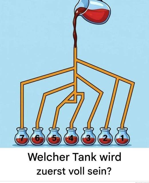 Ein Wasserhahn, ein paar Rohre, sieben Behälter … und eine scheinbar einfache Frage: Welcher füllt sich zuerst? Solche Rätsel sind reizvoll, weil sie weniger Rechnen als genaues Beobachten erfordern. Wichtig ist, nicht intuitiv zu antworten, sondern dem Wasserlauf zu folgen, als wäre man selbst ein Tropfen, der den Kreislauf hinunterpurzelt.
